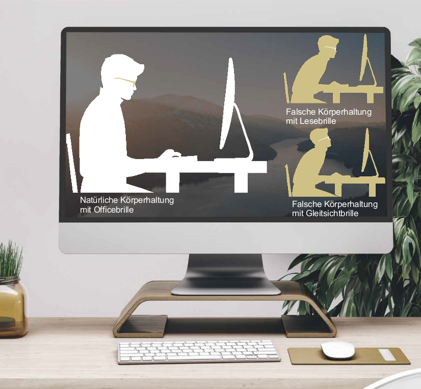 Sie wundern sich, warum Sie mit Ihrer Lesebrille die Texte am Bildschirm nicht richtig lesen können ? Sie haben bemerkt, dass Sie Ihren Kopf in den Nacken legen müssen, um mit Ihrer Gleitsichtbrille besser am Monitor zu arbeiten ? Beides ist einfach zu erklären und alles andere als optimal. Die Lesebrille ist für eine Entferungn von etwa 35-40 cm angefertigt, in der Sie gewöhnlich ein Buch oder eine Zeitschrift halten. Der Bildschirm aber ist mehr als eine Armlänge von Ihnen entfernt aufgestellt, deswegen sehen Sie weder mit der Lese- und häufig auch nicht mit der normalen Fernbrille perfekt am Monitor. Auch die vermeintliche Lösung - Gleitsichtbrille - stößt an ihre Grenzen. Warum? Weil die Sehentfernung, die besonders am Bildschirm gebraucht wird, nur durch einen schmalen Bereich des Glases korrigiert wird und nicht ohne Kopfbewegung genutzt werden kann.